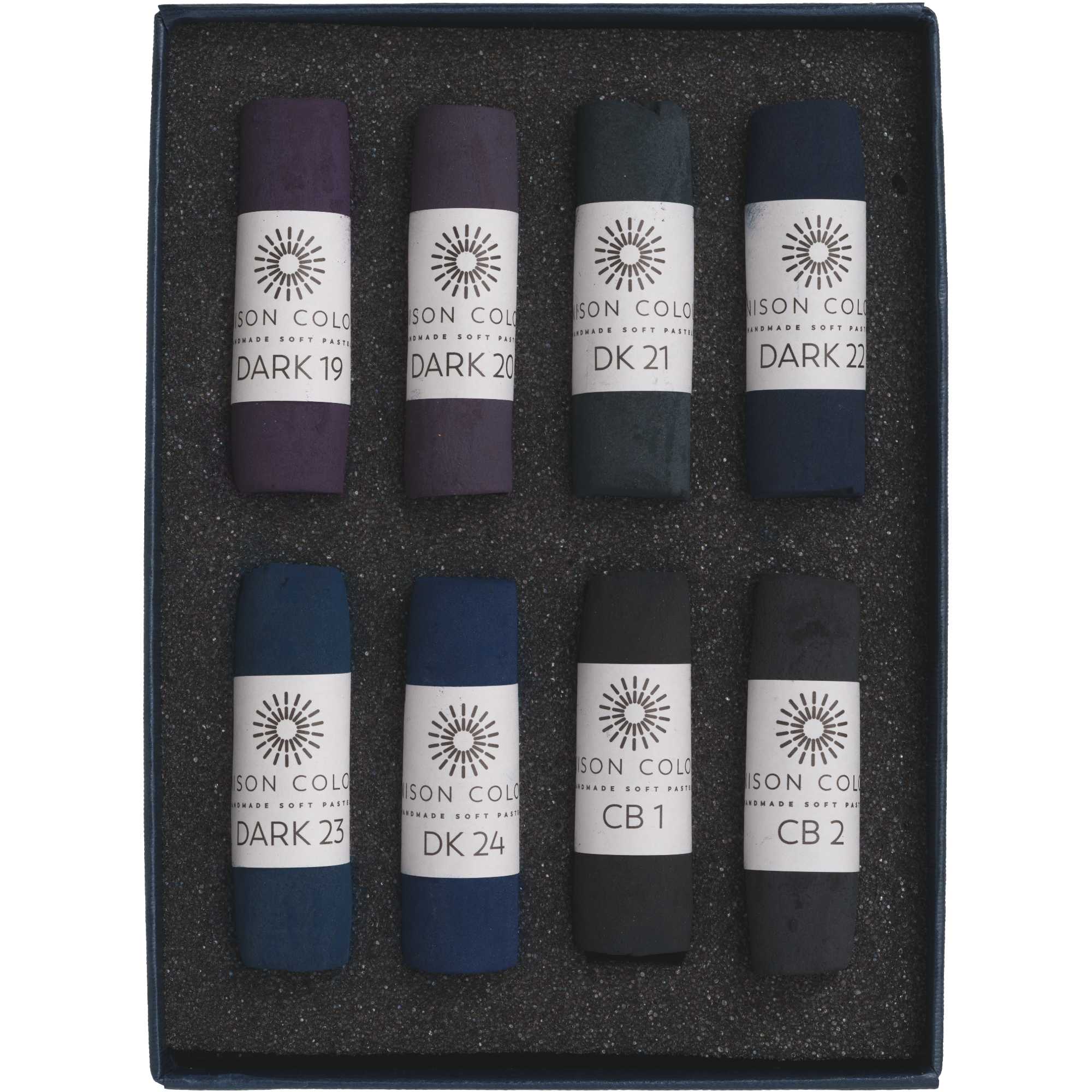 The Midnight 8 set is an extension of our Dark range, created by the colour experts at Unison Colour. We partnered with Australian artist, Chris Blake, to create Dark 19 and 20, and with British artist, Robert Dutton, to create Dark 24, which was an exploration into the deepest blue that we make. If you’re looking for a beautiful Prussian Blue in a soft textured pastel, then you’ve just found it. And not only that, to compliment it, we created Dark 22 and 23 by taking Dark 24, and increasing the red and green channels, to give you that perfect suite of intense, deep blues.